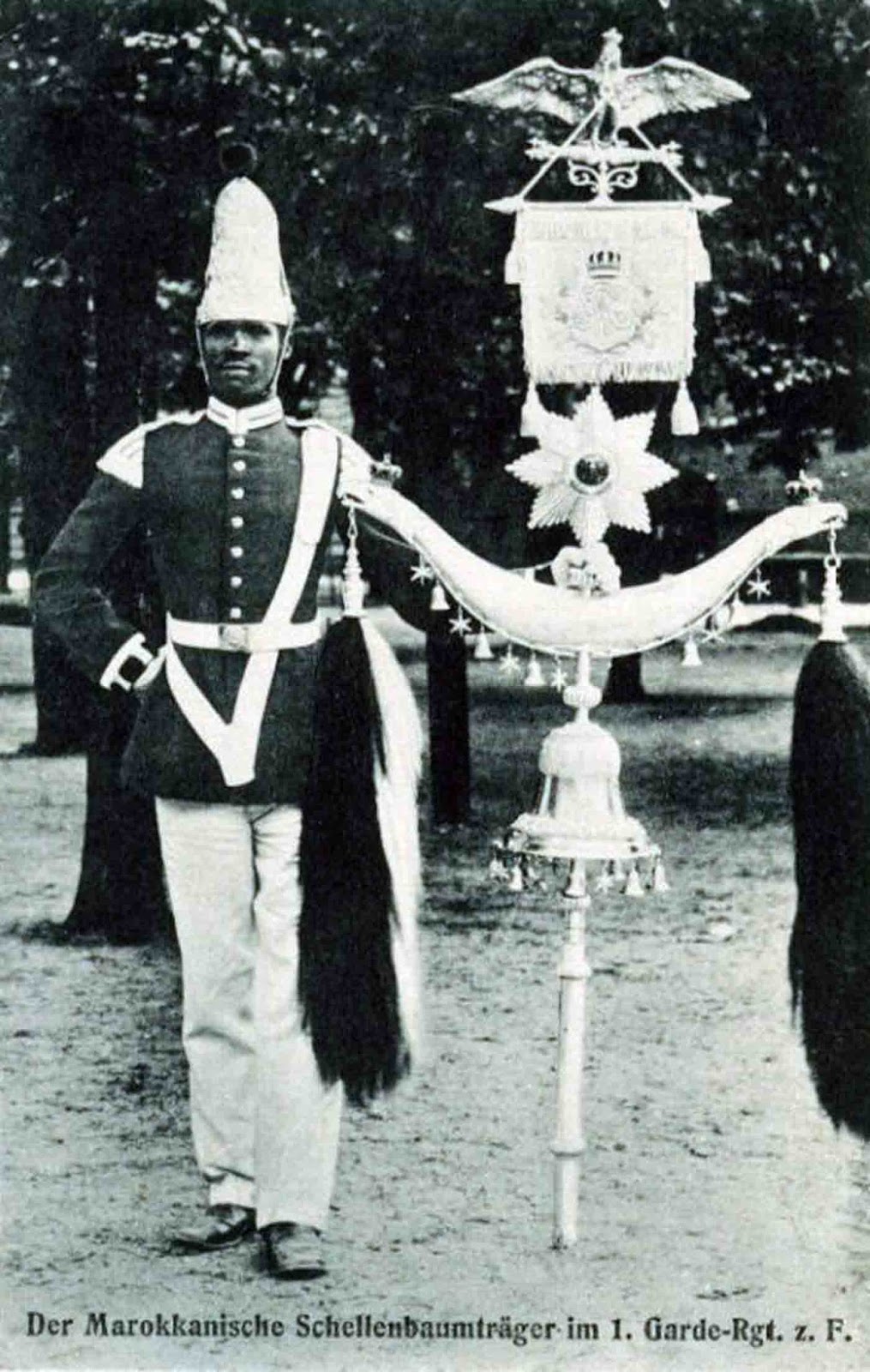 This photograph of Unteroffizier Ben Aissa of the 1st Prussian Foot Guards (“1. Garde-Regiment zu Fuß“) was taken in Potsdam in 1907. He wears a full dress uniform consisting of a dark blue Prussian Infantry tunic with white metal buttons, red piping, and red collar and Swedish cuffs both bearing white Litzen. The shoulder straps are plain white. As a player of the “Schellenbaum” or Turkish Crescent, he wears musicians swallow nests in red and white on each shoulder. The headdress is a Grenadier style mitre worn only on parade.