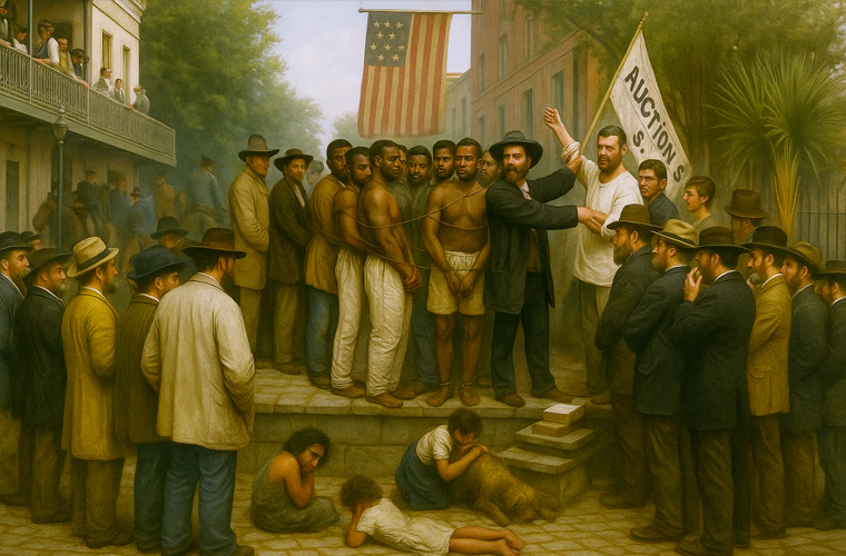 It poured rain relentlessly on those two days in early March 1859 at the Ten Broeck Race Course near Savannah, Georgia, transforming the open grounds into a muddy quagmire and driving sheets of water even into the covered grandstand. There, amid the downpour, the merchandise—hundreds of human lives reduced to commodities—had been assembled for the grim spectacle of an auction. The wind howled through the open sides of the structure, whipping the rain sideways and soaking the clusters of potential buyers who huddled under oilcloths, their faces set in expressions ranging from calculating detachment to barely concealed avarice. What the auction catalog described as “prime” offerings stood or sat in pens and stalls originally meant for racehorses and gentlemen’s carriages: sturdy field hands, skilled carpenters and wheelwrights, plowmen, rice and cotton pickers, cooks, laundresses, and seamstresses, alongside women, children, infants, the elderly, the lame, the blind, and the unsound.